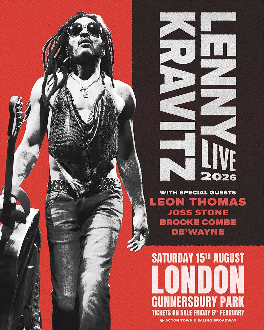 Four-time GRAMMY® Award-winning writer, producer, multi-instrumentalist and all around multi-hyphenate icon, LENNY KRAVITZ has announced a huge open-air show, taking place at London’s Gunnersbury Park on Saturday 15th August 2026. Joined by special guests LEON THOMAS, JOSS STONE, BROOKE COMBE and DE’WAYNE, the new date is part of a powerhouse live run with his Lenny Kravitz Live 2026 tour, bringing Kravitz’s celebrated live show to fans around the world.